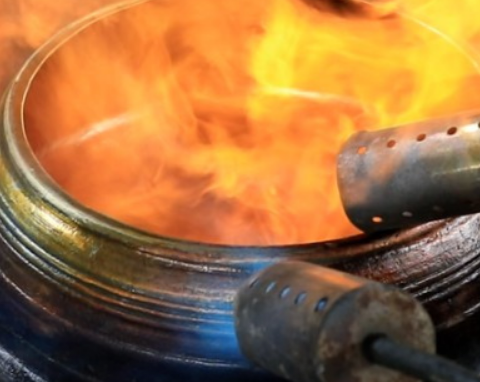 - 2. 솥이 뜨거워지면 들기름을 묻힌 키친타월로 내부와 외부를 꼼꼼히 닦아줍니다. 연기가 살짝 날 때까지 가열하는 과정을 2~3번 반복하면 구미 무쇠가마솥 특유의 광택이 살아납니다.