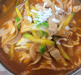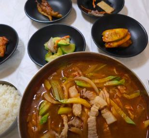 광주 광산구 평동로에 위치한 '골메골'은 광주 현지인들 사이에서 이미 명화식육식당과 더불어 광주식 애호박찌개 맛집으로 정평이 나 있는 곳입니다. 이곳의 애호박찌개는 밥이 말아져 나오는 국밥 스타일이 아닌, 큼지막한 냄비에 애호박, 돼지고기, 쌀떡 등이 푸짐하게 들어가 얼큰하게 끓여 먹는 스타일입니다.