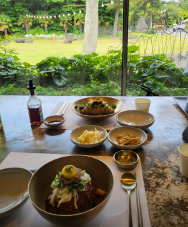 한라산아래첫마을은 제주 메밀을 활용한 다양한 향토 요리를 선보이는 곳으로, 제주민속촌 정문 근처에 위치해 접근성이 좋습니다. 이 한식당은 제주의 깨끗한 자연에서 나는 메밀과 제철 식재료를 사용하며, 특히 '제주메밀 비비작작면'은 들기름채소와 고명들이 듬뿍 올라간 비빔면으로, 건강한 맛과 뛰어난 식감으로 정평이 나 있습니다. 고풍스러운 원목 인테리어와 통창으로 보이는 정원 뷰는 식사의 만족도를 더욱 높여줍니다.