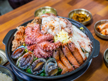 해산물에서 우러나오는 시원한 맛과 흑돼지해물갈비전골의 칼칼함이 조화를 이룹니다. 흑돼지해물갈비전골의 깊은 맛을 내기 위해 무를 넉넉히 넣으세요.