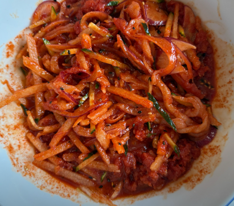 - 육수 합치기: 시판 냉면 육수와 숙성시킨 양념장을 잘 섞어줍니다. 개인의 취향에 따라 식초, 설탕을 추가하여 간을 맞춥니다.