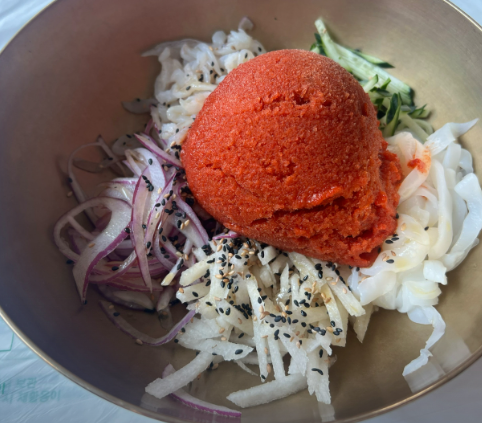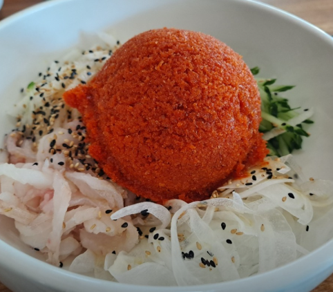 - 물회 완성: 그릇에 가자미회를 담고, 준비된 채소와 양파 채를 올립니다. 여기에 살얼음 상태의 물회 육수를 부어준 후, 통깨와 참기름을 살짝 뿌려줍니다.