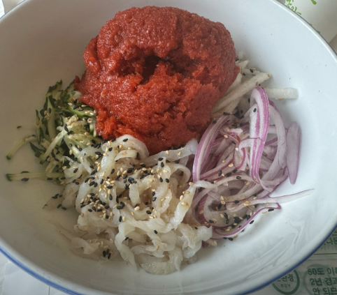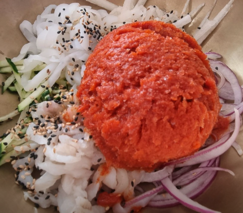 - 물회용 육수: 시판 냉면 육수 1팩 (250ml), 고추장 1.5T, 고춧가루 1T, 식초 2T, 설탕 1.5T, 매실액 1T, 다진 마늘 1/2T