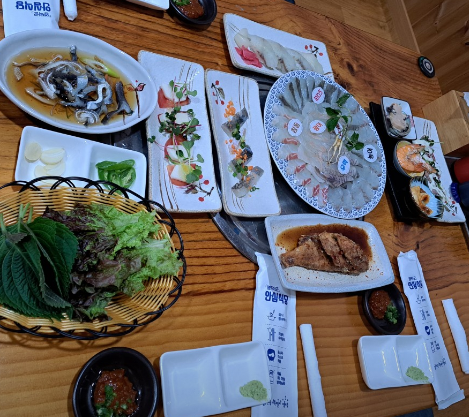 축산항횟집의 메뉴는 선택의 폭이 넓으면서도 각각의 요리가 전문점 수준의 맛을 자랑합니다. 가장 먼저 눈에 띄는 것은 영덕 자연산모듬회, 물회, 생우럭매운탕 조합입니다. 신선한 활어회를 맛본 뒤 칼칼한 매운탕으로 마무리하는 코스는 바다 여행의 정석입니다. 특히 이곳의 물회는 살얼음이 동동 띄워진 육수가 일품으로, 여름철 입맛을 돋우는 데 최고입니다.