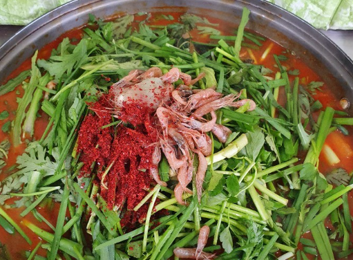 - 재료 준비: 민물새우(또는 냉동 새우) 200g, 무 1/3개, 양파 1/2개, 대파 1대, 쑥갓 약간, 콩나물 한 줌, 다진 마늘 1스푼. 양념장(고춧가루 3, 국간장 2, 된장 1, 다진 마늘 1, 생강 약간, 후추 약간).