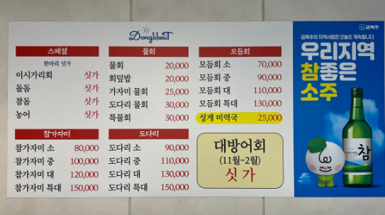 | 기타 활어회 | 참돔, 우럭 등 (계절 및 시세에 따라 변동) | 변동가 |