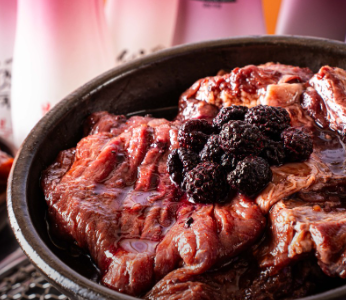 - 굽기: 달궈진 팬이나 그릴에 숙성된 고기를 올리고 중불에서 타지 않게 굽습니다. 양념에 복분자 성분이 있어 금방 탈 수 있으니 자주 뒤집어가며 구워줍니다.