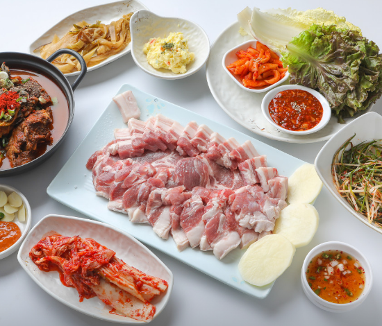 | 돼지모둠반판 (450g) | 삼겹살+목살+공단살 + 감자탕 서비스 + 어리굴쌈장 등 반찬 7종 | 43,000원 |