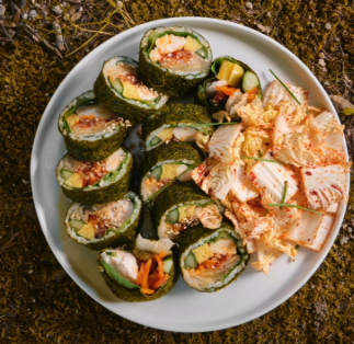 - 감태김밥 완성: 김밥을 단단하게 말아 먹기 좋은 크기로 썰어줍니다. 고소한 바다향의 감태와 아삭한 묵은지의 조합이 일품인 묵은지 감태김밥이 완성됩니다.