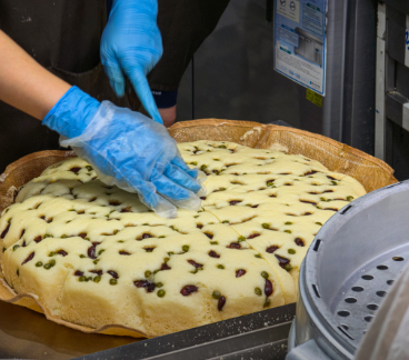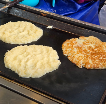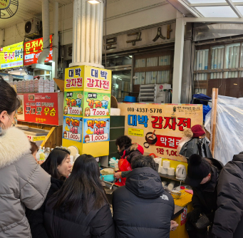 대박 감자전 매장 한편에는 막걸리를 셀프로 즐길 수 있는 공간이 있어, 7,000원이라는 저렴한 가격의 감자전 한 접시와 함께 최고의 궁합을 이룹니다. 감자전 테두리의 바삭한 부분은 아이들에게, 촉촉한 안쪽 부분은 어르신들에게 인기가 많습니다. 감자전 속에 다른 첨가물을 넣지 않아 감자 본연의 담백한 풍미가 살아있습니다. 대박 감자전 조리 과정을 지켜보는 것 또한 시장을 찾은 즐거움 중 하나입니다.