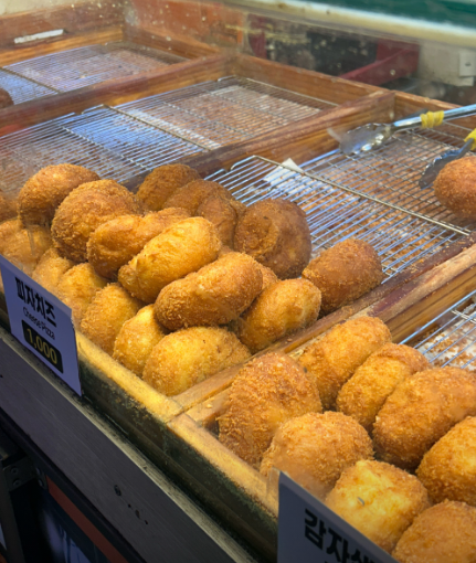 마지막으로 가벼운 간식으로 최고인 망원여행 수제돈까스, 골동품, 떡갈비, 수제고로케 맛집, 망원 수제 고로케입니다. 피자치즈, 김치, 야채, 단팥 등 취향대로 골라 먹는 재미가 있고 가격 또한 천 원이라는 놀라운 가성비를 자랑합니다. 망원시장의 상징과도 같은 이곳은 남녀노소 누구나 부담 없이 들러 따끈한 고로케를 맛볼 수 있습니다. 겉은 바삭하고 속은 촉촉한 완벽한 겉바속촉 고로케를 한입 베어 물면 여행의 피로가 싹 사라집니다.