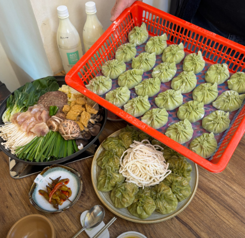 - 4. 전골 냄비 세팅: 냄비 바닥에 배추를 깔고 준비한 채소를 보기 좋게 돌려 담은 뒤, 가운데에 직접 빚은 복주머니 만두를 올립니다.