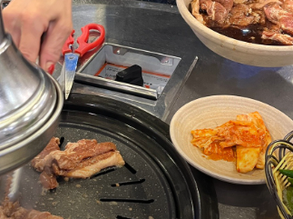 - 고기가 80% 정도 익으면 가위로 먹기 좋은 크기로 잘라줍니다.