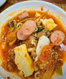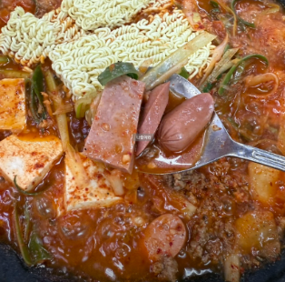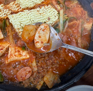 - 밥 위에 국물을 듬뿍 적신 햄과 김치를 올려 비벼 먹는 것이 의정부부대찌개의 별미입니다.