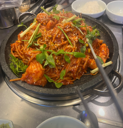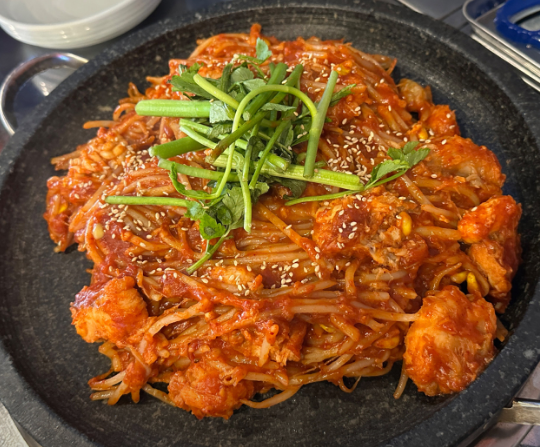 - 4. 콩나물 숨이 죽으면 전분물을 넣어 농도를 조절하고 마지막에 미나리와 참기름을 두릅니다. (무쇠 팬이나 두꺼운 돌판 팬을 사용하면 더욱 좋습니다.)