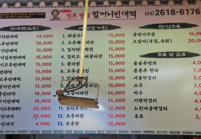 원조할머니빈대떡의 대표 빈대떡 및 전 메뉴 정보입니다. (가격은 지점 및 메뉴 구성에 따라 상이할 수 있습니다.)