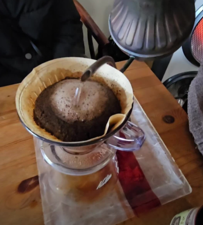 - 준비: 원두 20g을 핸드밀로 중간 굵기로 갈고, 드리퍼에 필터를 올린 후 뜨거운 물로 한 번 헹궈 예열합니다.