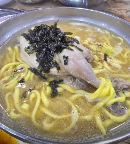 - 재료: 영계(삼계용) 1마리, 칼국수 면 1인분, 대파 1대, 마늘 5알, 양파 1/2개, 국간장 1T, 소금, 후추