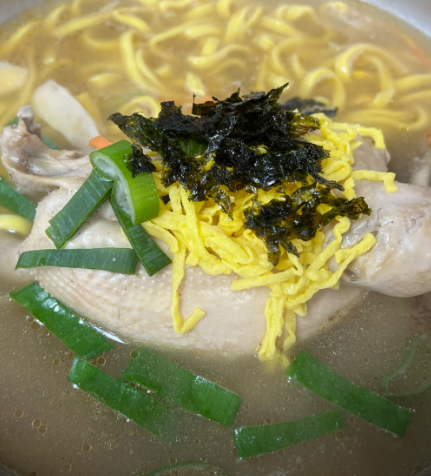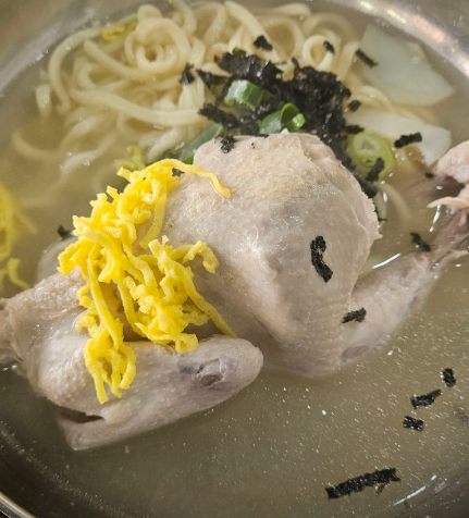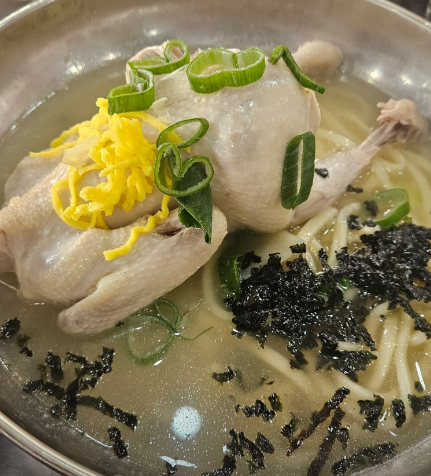 - 6. 완성: 그릇에 칼국수와 국물을 담고 삶아둔 닭 한 마리를 통째로 올려 마무리합니다.