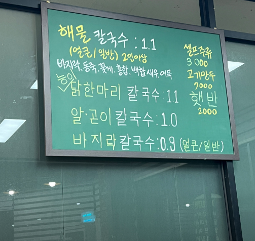 | 해물칼국수 | 얼큰한 맛과 일반 맛 선택 가능 (2인 이상) | 11,000원 |
