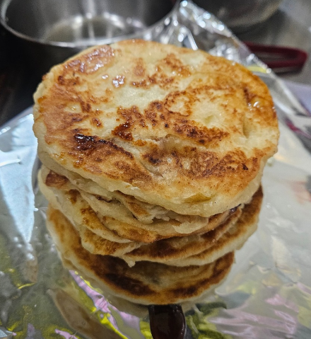 - 4. 팬에 기름을 넉넉히 두르고 반죽을 올린 뒤 누르개로 꾹 눌러 앞뒤로 노릇하게 굽습니다.