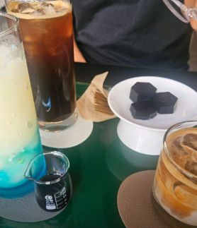 '쿠아'는 대전 유성구 신성동에 위치한 곳으로, 독창적인 '과학 미스터리 실험실' 콘셉트를 표방합니다. 입구에 들어서는 순간부터 플라스크, 비커, 시험관 등 과학 실험 도구들이 인테리어 소품으로 활용되어, 마치 미지의 실험실에 들어온 듯한 착각을 불러일으킵니다. 이곳은 평범함을 거부하고, 손님들에게 시각적인 즐거움과 호기심을 동시에 제공합니다. 특히, 메뉴명 또한 과학 용어에서 따온 듯 독특하며, 음료를 제조하는 과정 또한 실험을 연상시켜 보는 재미가 쏠쏠합니다.
