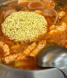 - 메인: 스팸, 소시지, 베이컨 등 다양한 햄 (고급 생햄 사용 추천), 김치 1/4 포기, 두부 1/4모, 양파 1/2개, 대파 1대, 떡, 라면 사리, 슬라이스 치즈 1장
