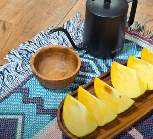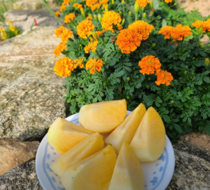 - 단감 손질: 태추단감을 깨끗이 씻어 껍질째 먹기 좋게 슬라이스하거나 깍둑썰기 합니다. (껍질이 얇아 깎지 않아도 됩니다.)