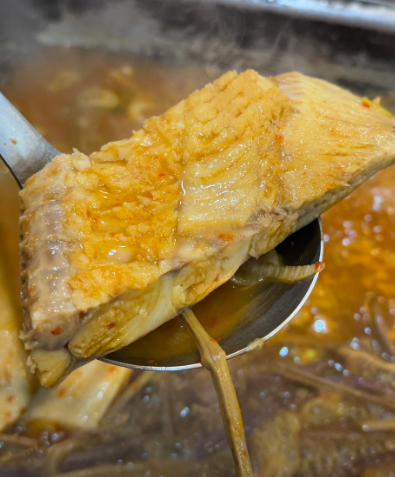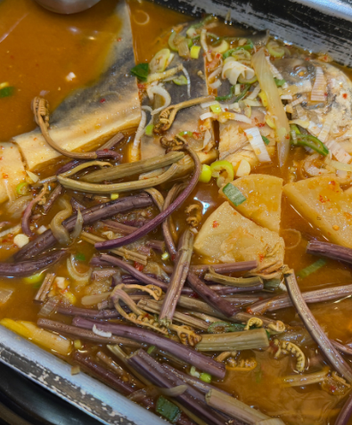 - 재료: 민어 서더리(뼈와 머리), 무 1/4개, 대파 1대, 미나리 한 줌, 청양고추 1개, 다진 마늘 1T