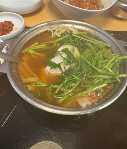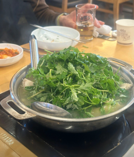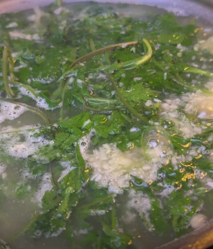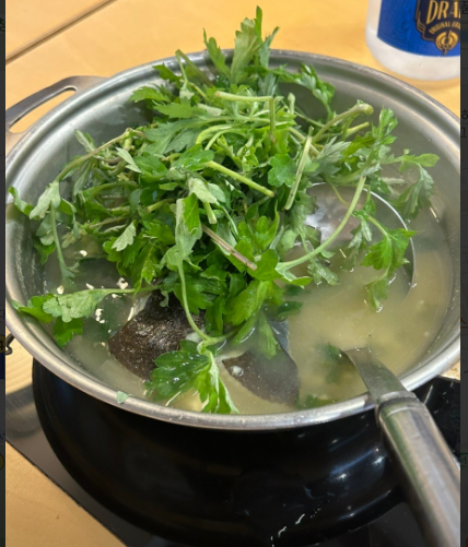 - 5. 마지막으로 깨끗이 씻은 쑥을 듬뿍 넣고 숨이 살짝 죽을 정도로만 끓여냅니다. (쑥을 너무 오래 끓이면 향이 날아가니 주의하세요.)