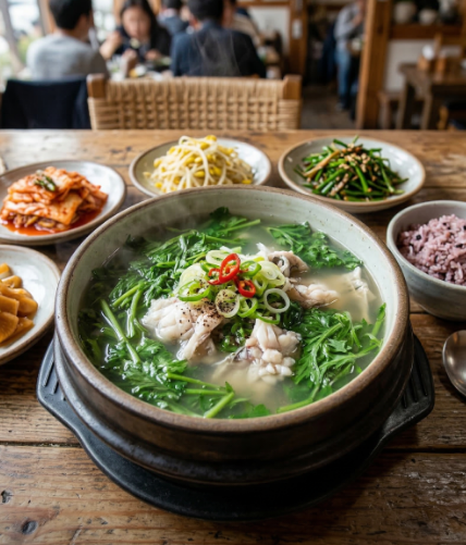 충무집의 시원한 맛을 가정에서 재현해 볼 수 있는 '도다리쑥국' 레시피를 소개합니다. 핵심은 신선한 쑥과 된장의 비율입니다.