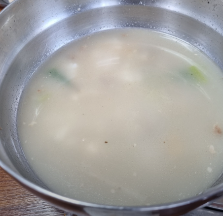 - 준비된 맑은 육수에 밑간한 닭고기를 넣고 한소끔 끓인 후, 소금으로 간을 맞춥니다.
