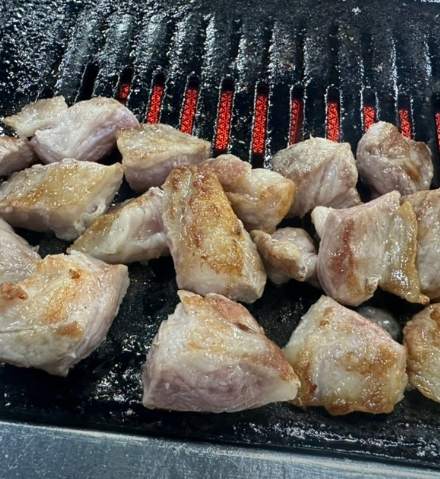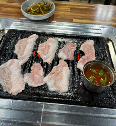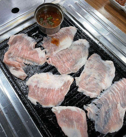 - 4. 무쇠 팬이나 코팅 팬을 연기가 살짝 날 정도로 달군 뒤 고기를 올립니다. 센 불에서 육즙을 가두는 것이 제주 가브리살 비결입니다.