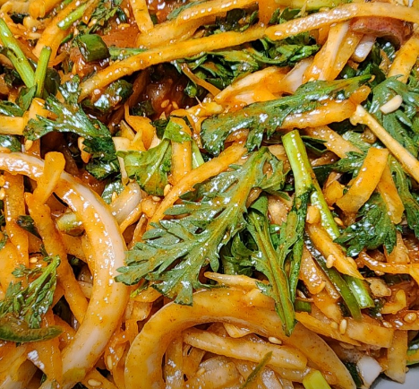 - 2. 채소 손질: 무와 오이는 가늘게 채 썰고, 배도 같은 크기로 썰어 준비합니다. 쪽파와 쑥갓은 적당한 길이로 자릅니다.