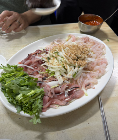 - 1. 재료 준비: 횟감 생선(광어, 우럭, 가자미 등), 무, 쪽파, 쑥갓, 배, 오이.