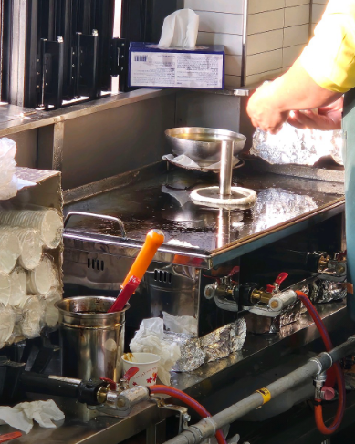 - 호떡 누르개나 뒤집개로 꾹 눌러주며 앞뒤로 노릇하게 굽습니다. 기름에 튀기듯 굽는 것이 상주 호떡장사 스타일입니다.