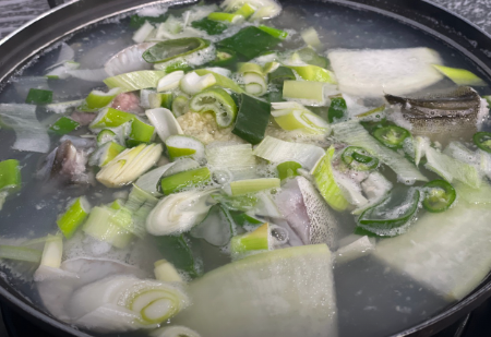 - **간 맞추기:** 곰치가 익어 살이 투명해지면 굵은 소금으로 간을 맞춥니다. 마지막에 대파와 청양고추를 넣고 한소끔 더 끓여냅니다. (기호에 따라 고춧가루를 추가해 얼큰함을 더합니다.)