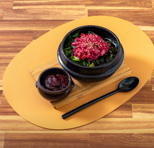 - 마무리: 육회 위에 계란 노른자 하나를 올리고, 비빔장을 따로 내어줍니다. 취향에 따라 참기름을 더 둘러 한우육회비빔밥을 완성합니다.