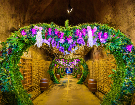 무주 적상산 자락에 위치한 와인동굴은 연중 일정한 온도를 유지하여 머루 와인이 숙성되기에 최적의 조건을 갖추고 있습니다. 입구에서부터 쏟아지는 화려한 조명과 와인 시음 코너, 그리고 지친 발의 피로를 풀어주는 와인 족욕 체험은 이곳의 백미입니다. 무주 덕유산 여행의 이색적인 추억을 남기기에 가장 좋은 장소입니다.