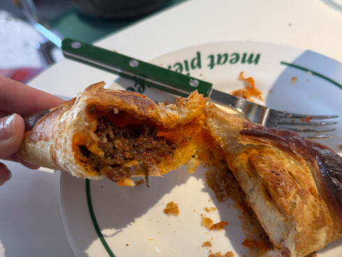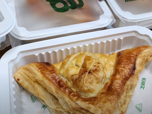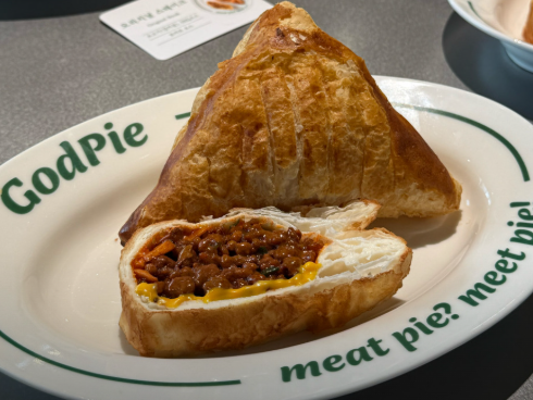 갓파이의 미트파이는 얇고 바삭한 파이 속에 월성찜갈비를 모티브로 한 매콤한 속재료를 가득 채워 넣은 것이 특징입니다.