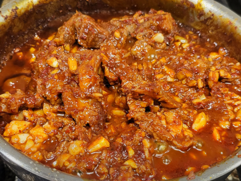 - 찜: 냄비에 갈비와 물 (갈비가 잠길 정도)을 넣고 끓입니다. 끓어오르면 거품을 걷어내고, 양념장의 2/3만 넣고 중약불에서 30분간 푹 끓여줍니다.