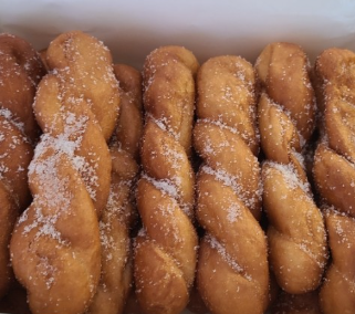 5. 마무리: 튀겨낸 꽈배기의 기름을 빼고, 설탕과 계피가루를 섞은 것에 굴려 마무리합니다. 극한직업 꽈배기의 쫄깃함을 집에서도 느껴보세요.