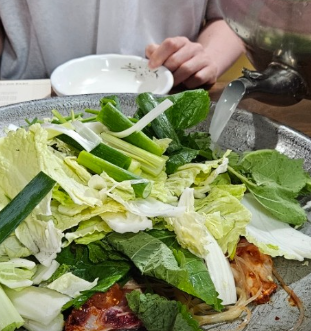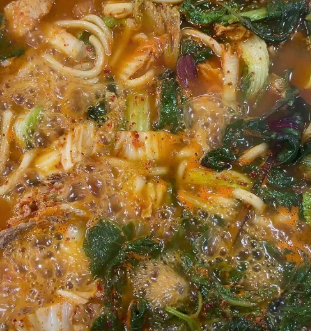 - 채소 및 떡 추가: 양파, 대파, 떡 등 나머지 채소와 떡을 넣고 5분 정도 더 끓입니다. 이때 깻잎을 넉넉히 넣으면 풍미가 살아납니다.