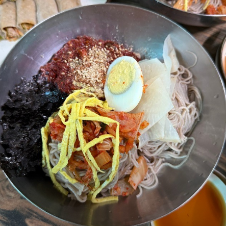 - 3. 면 삶기: 끓는 물에 메밀면을 넣고 삶은 뒤, 찬물에 박박 문질러 전분기를 제거하고 물기를 뺍니다.