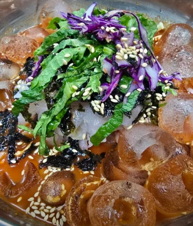 - 5. 완성하기: 그릇에 채소를 깔고 그 위에 회를 듬뿍 올린 뒤, 살얼음이 낀 육수를 부어줍니다. 마지막으로 통깨와 들기름 한 방울을 떨어뜨리면 완성입니다.