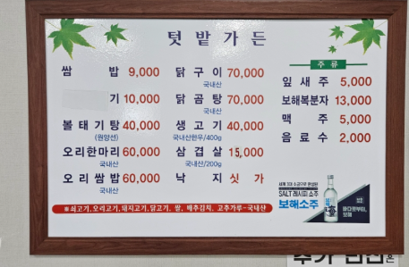 텃밭가든의 대표 메뉴인 오리한마리, 닭구이, 닭곰탕 및 기타 메뉴의 가격 정보입니다. (닭구이와 닭곰탕 가격은 닭한마리 코스에 포함되거나, 한 마리 단위의 요리 가격일 가능성이 높습니다. 방문 전 식당에 정확한 코스 구성을 문의하는 것을 추천합니다.)