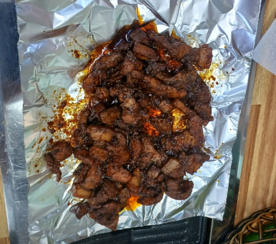 - 고기가 80% 정도 익으면, 토치(가정용)를 이용해 겉면을 살짝 그을려 불향을 입힙니다. (주의: 환기 필수 및 안전에 유의)
