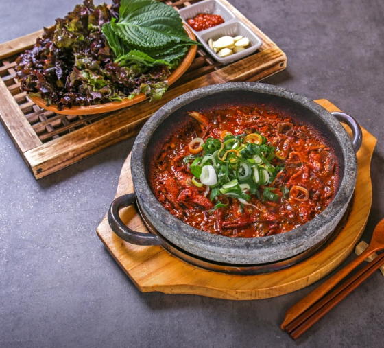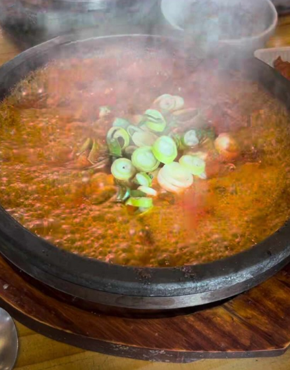 - 5. 마지막에 대파와 청양고추를 넣고 한소끔 더 끓인 뒤 싱싱한 쌈 채소와 곁들입니다.