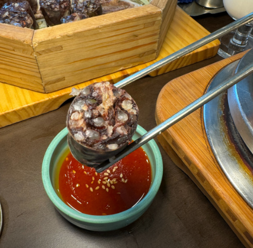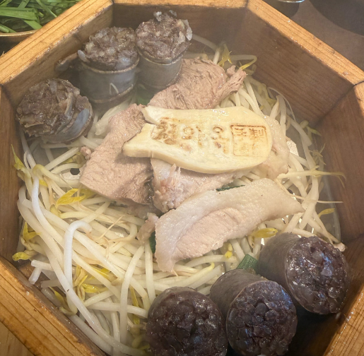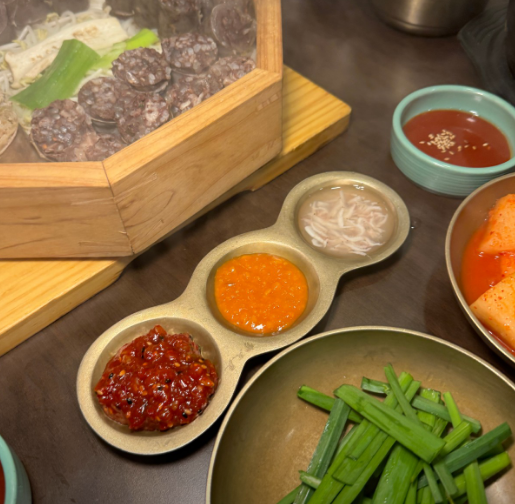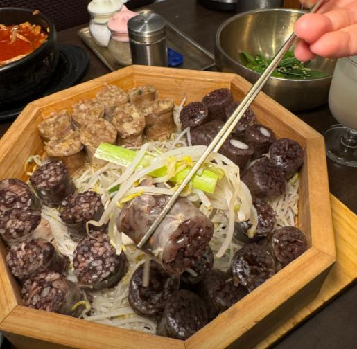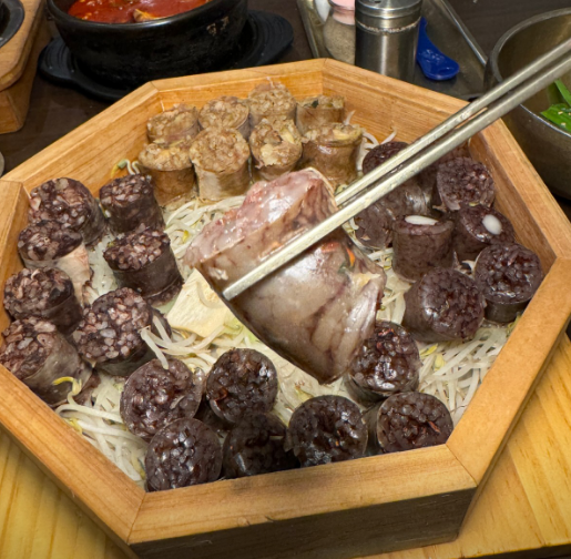 • 재료: 돼지고기 수육용(삼겹살 또는 사태) 500g, 시중 판매용 순대, 숙주나물 200g, 부추 약간, 팽이버섯 1봉, 맛술 2T