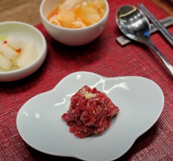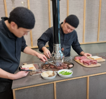 - 팬 가열: 무쇠 팬이나 두꺼운 팬을 연기가 날 정도로 충분히 강하게 가열합니다. (한우 우마카세처럼 빠르게 겉면을 익히기 위함)